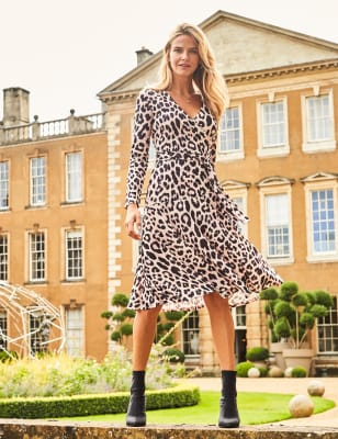 Animal Print Belted Faux Wrap Dress